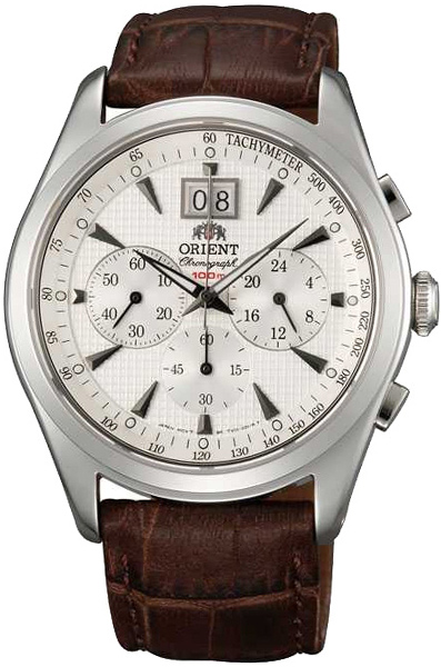 Мужские кварцевые наручные часы с хронографом (секундомером) Orient TV01005W (FTV01005W0). Калибр механизма — TV(KFC). Секундомер может отсчитывать до 60-ти минут, так же на циферблате часов присутствует шкала тахиметра для измерения средней скорости движения. На данной модели отображается дата и индикация времени суток (24-х часовая шкала). Стрелки и метки покрыты люминесцентным напылением (светятся в темноте). Завинчивающаяся заводная головка и задняя крышка для более уверенной водонепроницаемости часов. Сапфировое стекло. Водонепроницаемость WR100 (10 атм).