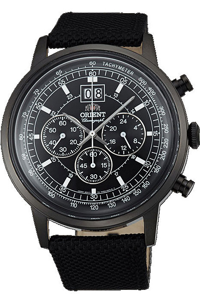 Мужские кварцевые наручные часы с хронографом (секундомером) Orient TV02001B (FTV02001B0). Калибр механизма — TV(KFC). Секундомер может отсчитывать до 60-ти минут, так же на циферблате часов присутствует шкала тахиметра для измерения средней скорости движения. На данной модели отображается дата и индикация времени суток (24-х часовая шкала). Стрелки и метки покрыты люминесцентным напылением (светятся в темноте). На корпус нанесено стойкое PVD покрытие. Текстильный ремешок. Завинчивающаяся задняя крышка для более уверенной водонепроницаемости часов. Водонепроницаемость WR50 (5 атм).