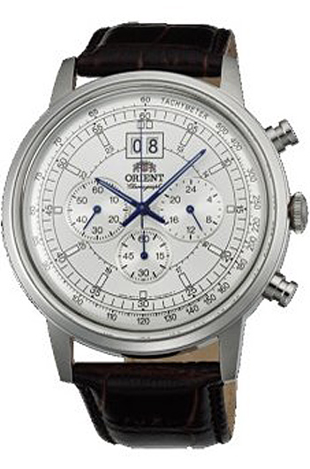 Мужские кварцевые наручные часы с хронографом (секундомером) Orient TV02004W (FTV02004W0). Калибр механизма — TV(KFC). Секундомер может отсчитывать до 60-ти минут, так же на циферблате часов присутствует шкала тахиметра для измерения средней скорости движения. На данной модели отображается дата и индикация времени суток (24-х часовая шкала). Стрелки и метки покрыты люминесцентным напылением (светятся в темноте). Завинчивающаяся задняя крышка для более уверенной водонепроницаемости часов. Водонепроницаемость WR50 (5 атм).