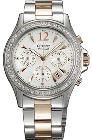 Женские кварцевые наручные часы c хронографом (секундомером) Orient TW00003W. Калибр механизма — TW(KFD). Секундомер может отсчитывать до 60 минут с шагом 1/5 секунды. Стрелки покрыты люминесцентным напылением (светятся в темноте). Корпус и браслет данной модели частично покрыт PVD покрытием розового цвета, а так же корпус часов украшен камнями из циркона. Сапфировое стекло.