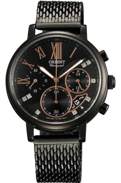 Женские кварцевые наручные часы c хронографом (секундомером) Orient TW02001B (FTW02001B0). Калибр механизма — TW(KFD). Секундомер может отсчитывать до 60 минут с шагом 1/5 секунды. Стрелки покрыты люминесцентным напылением (светятся в темноте). Корпус данной модели полностью покрыт PVD покрытием.