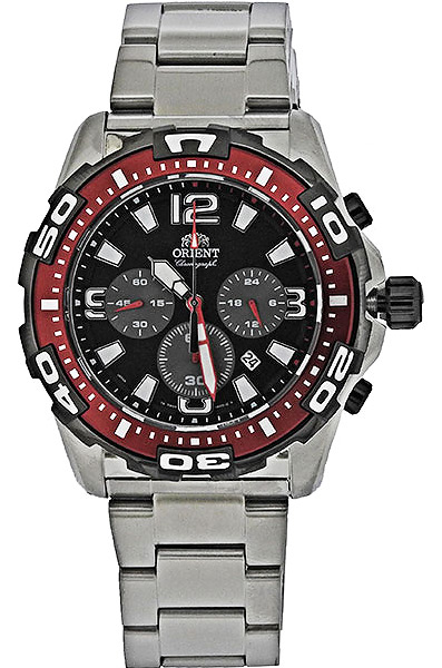 Мужские кварцевые наручные часы с хронографом (секундомером) Orient TW05001B (FTW05001B0). Калибр механизма — TW(KFD). Секундомер может отсчитывать до 60-ти минут. На данной модели отображается дата и индикация времени суток (24-х часовая шкала). Стрелки и метки покрыты люминесцентным напылением (светятся в темноте). Завинчивающаяся заводная головка и задняя крышка для более уверенной водонепроницаемости часов. На корпус частично нанесено стойкое PVD покрытие. Вращающийся безель. Водонепроницаемость WR100 (10 атм).