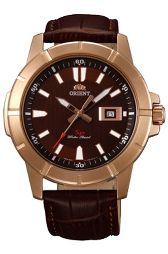 Мужские кварцевые наручные часы Orient UNE9002T. Калибр механизма — UN(HT7). На данной модели отображается дата. Стрелки и метки покрыты люминесцентным напылением (светятся в темноте). На корпус нанесено PVD покрытие розового цвета. Завинчивающаяся задняя крышка.