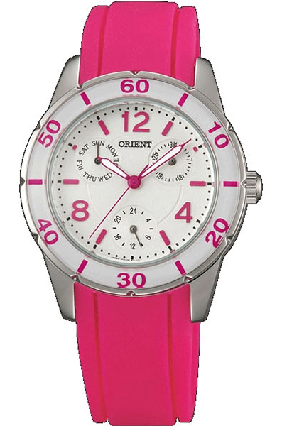 Женские кварцевые наручные часы Orient UT0J004W (FUT0J004W0). Калибр механизма — UT(H4A). На данной модели отображается дата, день недели и время суток. Водонепроницаемость WR50 (5 атм).