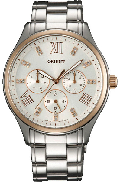 Женские кварцевые наручные часы Orient UX01004W. Калибр механизма — UX(H4B). На данной модели отображается дата, день недели и время суток (24-х часовая шкала). Циферблат украшен камнями из циркона.