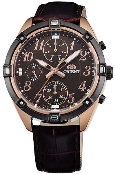 Женские кварцевые наручные часы Orient UY04004T (FUY04004T0). Калибр механизма — UY. На данной модели отображается дата, день недели и время суток (24-х часовая шкала). Стрелки и метки покрыты люминесцентным напылением (светятся в темноте). Корпус украшен камнями из циркона. На корпус нанесено стойкое PVD покрытие. Водонепроницаемость WR50 (5 атм).