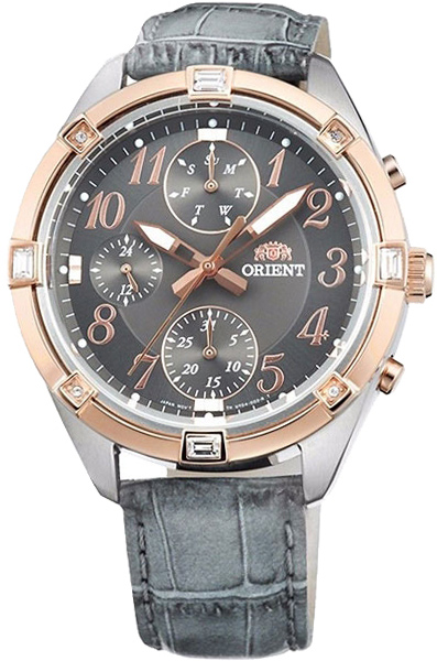 Женские кварцевые наручные часы Orient UY04005A (FUY04005A0). Калибр механизма — UY. На данной модели отображается дата, день недели и время суток (24-х часовая шкала). Стрелки и метки покрыты люминесцентным напылением (светятся в темноте). Корпус украшен камнями из циркона. На корпус частично нанесено стойкое PVD покрытие. Водонепроницаемость WR50 (5 атм).