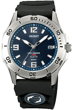 Мужские кварцевые наручные часы на солнечной батарее Orient WE00004D коллекции Light Powered 4000. Калибр механизма — WE(KL7). Данная модель не требует замены батареи. Время непрерывной работы от полностью заряженного состояния до полной остановки - около 10 месяцев. На данной модели отображается дата. Стрелки и метки покрыты люминесцентным напылением (светятся в темноте). Данная модель обладает высокой степенью водонепроницаемости WR200 (20 атм) и подходит для глубокого погружения под воду. Завинчивающаяся заводная головка и задняя крышка для более уверенной водонепроницаемости часов. Вращающийся безель.