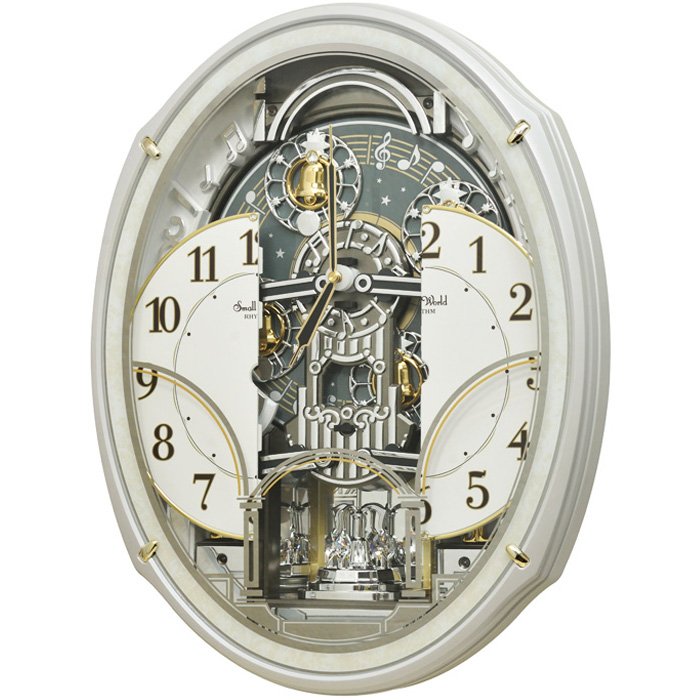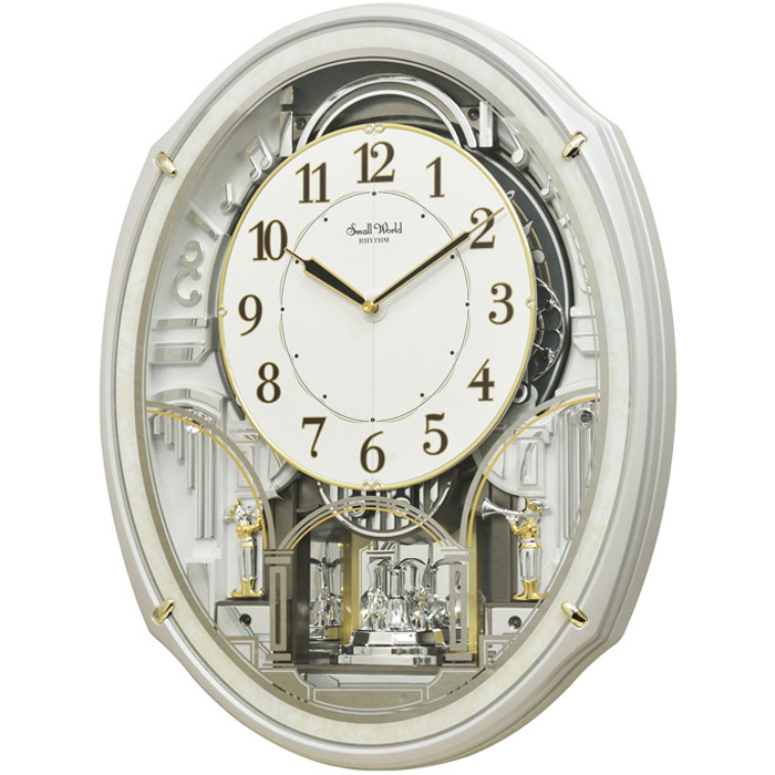 Кварцевые музыкальные настенные часы Rhythm 4MH435WR03 Harmony Blessing II. Данная модель работает от батареек типа С x 2 шт. (входят в комплект). Почасовая мелодия. Во время звучания мелодии циферблат раскалывается на две части, показывая вращающиеся разноцветные колокольчики и музыкальные ноты. Затем циферблат опускается в нижнюю часть, закрывается и поднимается вверх. Мелодии 12+12 классических +6 рождественских мелодии (СTS звучание). Маятник оформлен кристаллами Swarovski. Регулятор громкости. Режим демонстрации. Автоматический выключатель мелодии в темноте с сенсорным датчиком. Ход стрелки — плавный (бесшумный).