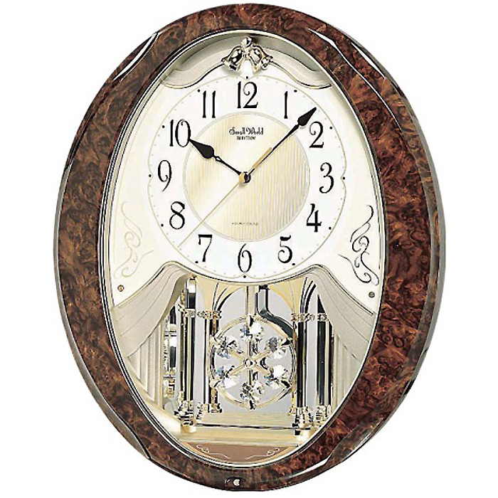 Кварцевые музыкальные настенные часы с маятником Rhythm 4MJ862WD23. Данная модель работает от батареек типа C x 4 шт. (входят в комплект). Маятник украшен кристаллами Swarovski. Плавный ход маятника. Почасовая мелодия. Режим демонстрации. Автоматический глушитель мелодии в ночное время суток с сенсорным датчиком. Корпус украшен кристаллом Swarovski. Выключатель музыкального сопровождения. Регулятор звука. 6+6 классических, +4 рождественских мелодии. Ход секундной стрелки — дискретный (тикают).