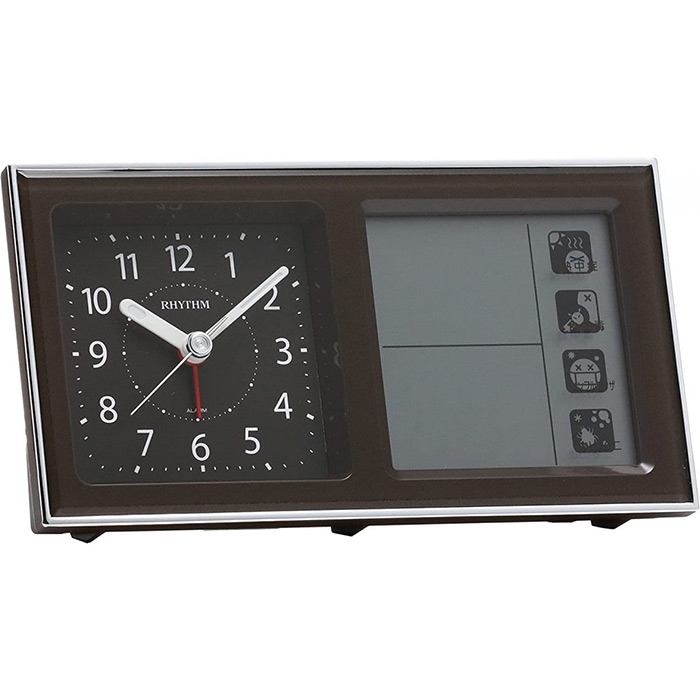 Многофункциональные кварцевые часы-будильник Rhythm 8RE678SR06. Данная модель работает от батареек типа R6(AA) x 2 шт. (входят в комплект). Термометр, гигрометр и индикатор опасности. Диапазон измерения: температуры от -9,9 градусов до +50 градусов, влажности от 20% до 95%. Функция записи максимальной и минимальной температуры и влажности за последние 24 часа. 4 сигнала, предупреждающие об опасном нарушении стандартов окружающей среды: Тепловой удар, пищевое отравление, простуда, плесень/пылевой клещ. Повтор сигнала будильника. Принудительная подсветка. Тип сигнала - импульсный. Корпус выполнен из пластика. Ход секундной стрелки — плавный (бесшумный).