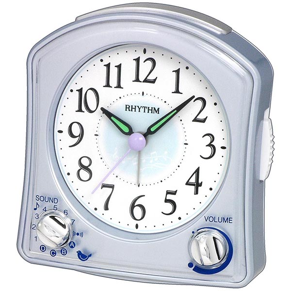 Кварцевый музыкальный будильник Rhythm 8RMA02WR04 с возможностью выбора мелодии и плавной регулировкой громкости. 7 мелодий, 4 звука пения птиц и обычный сигнал. Данная модель работает от батареек типа R6(AA) x 3 шт. (входят в комплект). Корпус выполнен из пластика. Принудительная подсветка. Функция повтора срабатывания будильника (Snooze) — интервал 5 минут. Ход секундной стрелки — плавный (бесшумный).