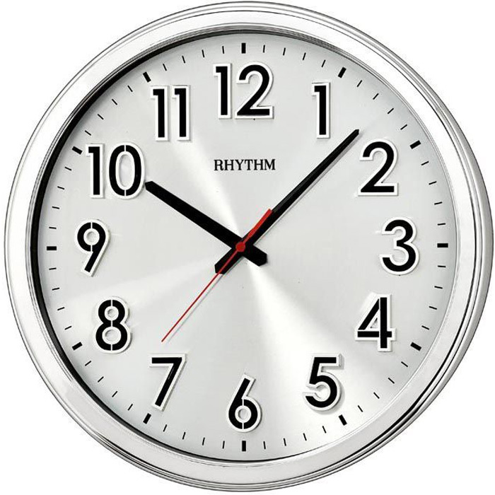 Кварцевые настенные часы Rhythm CMG533NR19. Данная модель работает от батарейки типа R6(AA) x 1 шт. (входит в комплект). Корпус выполнен из пластика. Циферблат изготовлен из алюминия. Объемные цифры. Ход секундной стрелки — плавный (бесшумный).