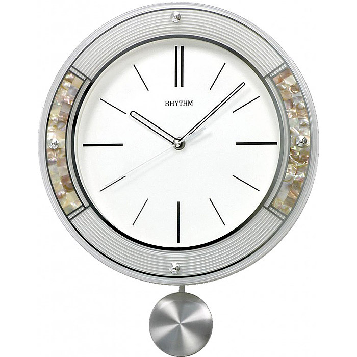 Кварцевые настенные часы Rhythm CMP532NR18 с маятником. Данная модель работает от батареек типа R20(D) x 2 шт. (входят в комплект). Корпус выполнен из стекла+пластика и украшен перламутром. Ход секундной стрелки — дискретный (тикают). Форма стекла — плоское.