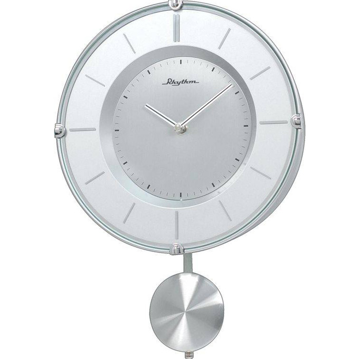 Кварцевые настенные часы Rhythm CMP534NR19 с маятником. Данная модель работает от батареек типа R6(AA) x 2 шт. (входят в комплект). Корпус изготовлен из пластика. Ход секундной стрелки — плавный (бесшумный).