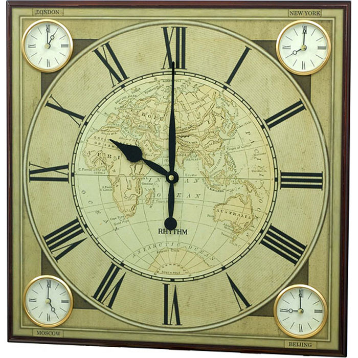 Кварцевые настенные часы Rhythm CMW904NR06 с возможностью установки времени в 5-ти разных часовых поясах. В комплекте 37 шильдиков с названиями крупных городов и 3 шильдика без обозначения (можно указать свои названия городов). Данная модель работает от батареек типа R6(AA) x 5 шт. (входят в комплект). Корпус изготовлен из дерева. Ход секундной стрелки — плавный (бесшумный).