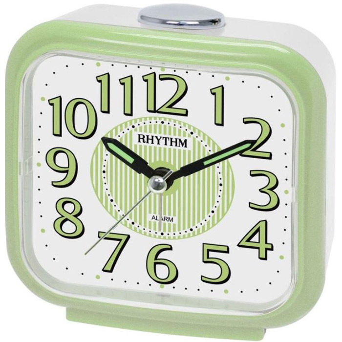Кварцевый будильник Rhythm CRF803NR05 с возможностью выбора варианта звука (сигнал или громкий звонок). Данная модель работает от батарейки типа R14(C) x 1 шт. (входит в комплект). Корпус выполнен из пластика. Принудительная подсветка. Функция повтора срабатывания будильника (Snooze) — интервал 5 минут. Стрелки и цифры покрыты люминесцентным напылением (светятся в темноте). Голографические цифры. Ход секундной стрелки — плавный (бесшумный).