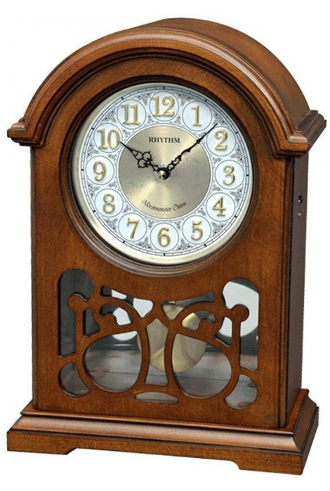 Кварцевые музыкальные настольные часы с боем и маятником Rhythm CRJ754NR06. Данная модель работает от батареек типа АА x 2 шт. (входят в комплект). Максимально приближенный к настоящему звук боя и мелодий — запатентованная разработка воспроизведения звука компании Rhythm «Sound In Place». Варианты звукового сопровождения: Ежечасная мелодия «Westminster» с боем; ежечасная мелодия «Westminster» с боем и проигрыванием части мелодии каждую четверть часа. 16 классических мелодий. 3 рождественские мелодии. Автоматическое выключения звука с 22:00 — 06:00. Плавная регулировка громкости мелодий. Корпус выполнен из дерева. Рама,отделанная лазером. Объемные цифры. Ход стрелки — плавный (бесшумный).