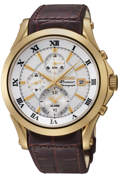 Мужские кварцевые наручные часы с хронографом (секундомером) и будильником Seiko SNAF22J1 коллекции Premier Японской сборки. Калибр механизма — 7T62. Секундомер может отсчитывать до 60 минут с шагом 1/5 секунды. Будильник может быть установлен в течение ближайших 12 часов. На данной модели отображается дата. Сапфировое стекло. На корпус нанесено PVD покрытие. Ремешок - телячья кожа. Завинчивающаяся задняя крышка часов. Водонепроницаемость WR100 (10 атм).