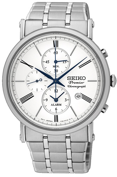 Мужские кварцевые наручные часы с хронографом (секундомером) и будильником Seiko SNAF73P1 коллекции Premier. Калибр механизма — 7T62. Секундомер может отсчитывать до 60 минут с шагом 1/5 секунды. Будильник может быть установлен в течение ближайших 12 часов. На данной модели отображается дата. Сапфировое стекло. Завинчивающаяся задняя крышка часов. Водонепроницаемость WR100 (10 атм).