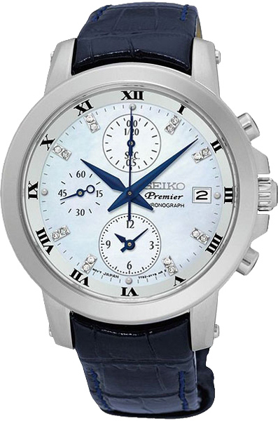 Женские кварцевые наручные часы с хронографом (секундомером) Seiko SNDV59P2 коллекции Premier. Калибр механизма — 7T92. Перламутровый циферблат украшенный бриллиантами. Секундомер может отсчитывать до 12 часов с шагом 1/20 секунды. На данной модели отображается дата. Сапфировое стекло. Ремешок — телячья кожа. Завинчивающаяся задняя крышка часов. Водонепроницаемость WR100 (10 атм).