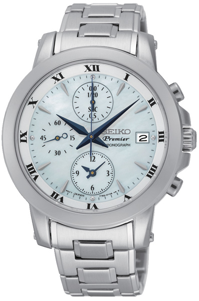 Женские кварцевые наручные часы с хронографом (секундомером) Seiko SNDV71P1 коллекции Premier. Калибр механизма — 7T92. Перламутровый циферблат. Секундомер может отсчитывать до 12 часов с шагом 1/20 секунды. На данной модели отображается дата. Сапфировое стекло. Завинчивающаяся задняя крышка часов. Водонепроницаемость WR100 (10 атм).