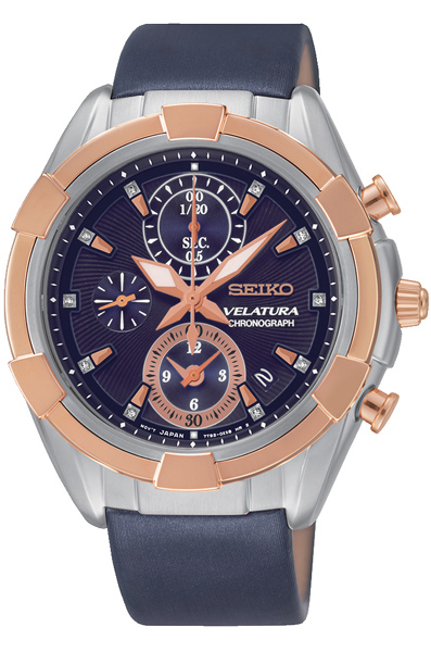 Женские кварцевые наручные часы с хронографом (секундомером) Seiko SNDW08P1 коллекции Velatura. Калибр механизма — 7T92. Секундомер может отсчитывать до 12 часов с шагом 1/20 секунды. На данной модели отображается дата. Стрелки и метки покрыты люминесцентным напылением LumiBright (светятся в темноте). Установлено сапфировое стекло с антибликовым покрытием. Циферблат украшен бриллиантами. Ремешок — телячья кожа. На корпус частично нанесено стойкое PVD покрытие. Водонепроницаемость WR100 (10 атм).