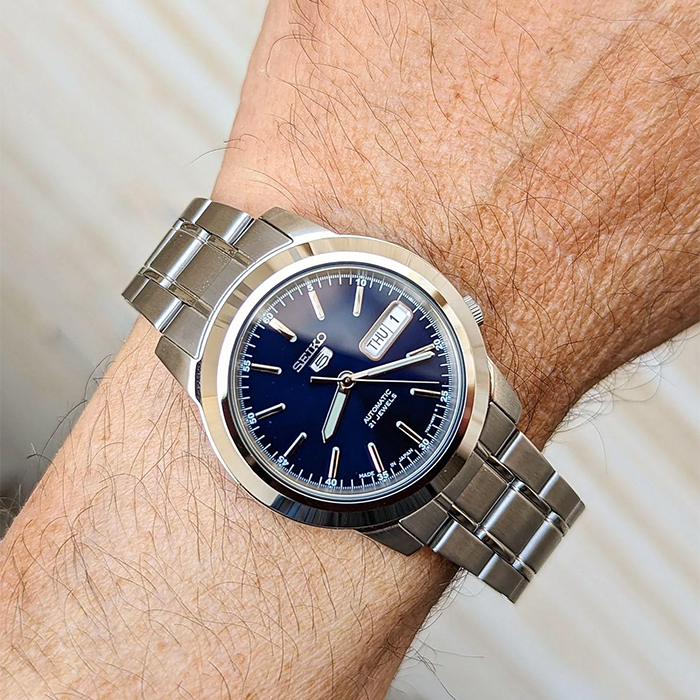 Мужские механические наручные часы японского производства с автоподзаводом Seiko SNKE51J1 коллекции Seiko 5. Калибр механизма — 7S26. Запас хода - не менее 40-ка часов. 21 600 полуколебаний в час. Количество камней - 21. На данной модели отображается дата и день недели. Стрелки и метки покрыты люминесцентным напылением LumiBright (светятся в темноте). Установлено минеральное стекло повышенной прочности Hardlex Crystal. Прозрачная завинчивающаяся задняя крышка часов. Стальной браслет. Водонепроницаемость WR (3 атм). Японская сборка (Made In Japan).