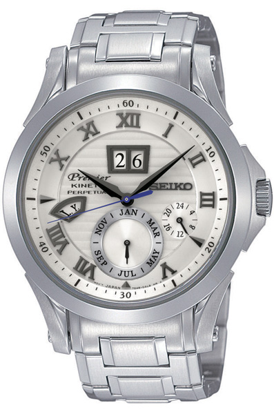 Мужские автокварцевые наручные часы с вечным календарем Seiko SNP057J1 коллекции Premier с механизмом Kinetic. Калибр механизма — 7D48. Аккумулятор данной модели заряжается от движения руки. Срок работы аккумулятора с полным зарядом — около 6-ти месяцев. Примерный срок службы аккумулятора — 10 лет. Автоматический календарь до 2100 года. Присутствует функция информирования о недостаточном заряде и функция сохранения энергии (часы автоматически включают энергосберегающую функцию, если Вы не носите их более 24 часов, если Вы решите надеть часыснова, достаточно покачать их несколько раз, стрелки придут в движение и покажут точноевремя). На данной модели отображается дата, текущий месяц и время суток (24-х часовая шкала). Сапфировое стекло. Завинчивающаяся задняя крышка часов. Водонепроницаемость WR100 (10 атм). Японская сборка.