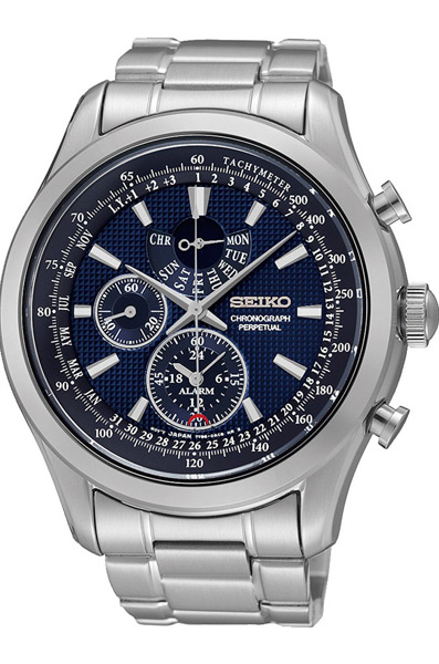 Мужские кварцевые наручные часы с вечным календарем, хронографом (секундомером) и будильником Seiko SPC125P1 коллекции CS Dress. Калибр механизма — 7T86. На данной модели отображается дата и день недели. Автоматический календарь до 28 февраля 2100 года. Будильник может быть установлен в пределах 24-часового периода относительно текущего времени. Секундомер может отсчитывать до 24 часов с точностью 1/5 секунды, так же на циферблате часов присутствует шкала тахиметра для измерения средней скорости движения. Установлено минеральное стекло повышенной прочности Hardlex Crystal. Завинчивающаяся задняя крышка часов. Водонепроницаемость WR100 (10 атм).
