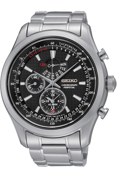Мужские кварцевые наручные часы с вечным календарем, хронографом (секундомером) и будильником Seiko SPC127P1 коллекции CS Dress. Калибр механизма — 7T86. На данной модели отображается дата и день недели. Автоматический календарь до 28 февраля 2100 года. Будильник может быть установлен в пределах 24-часового периода относительно текущего времени. Секундомер может отсчитывать до 24 часов с точностью 1/5 секунды, так же на циферблате часов присутствует шкала тахиметра для измерения средней скорости движения. Установлено минеральное стекло повышенной прочности Hardlex Crystal. Завинчивающаяся задняя крышка часов. Водонепроницаемость WR100 (10 атм).