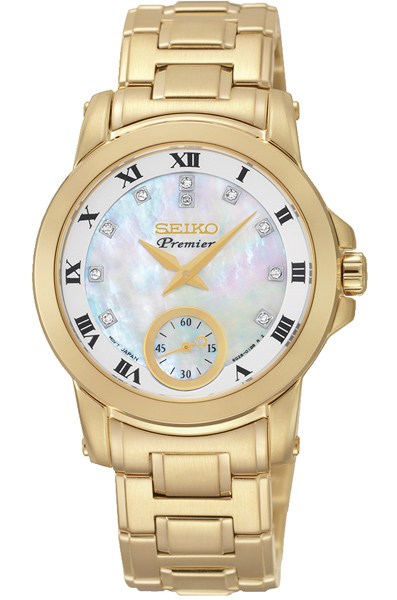 Женские кварцевые наручные часы Seiko SRKZ60P1 коллекции Premier. Калибр механизма — 6G28. На данной модели отображается дата. Сапфировое стекло. Перламутровый циферблат украшенный бриллиантами. На корпус и браслет данной модели нанесено стойкое PVD покрытие. Водонепроницаемость WR100 (10 атм).