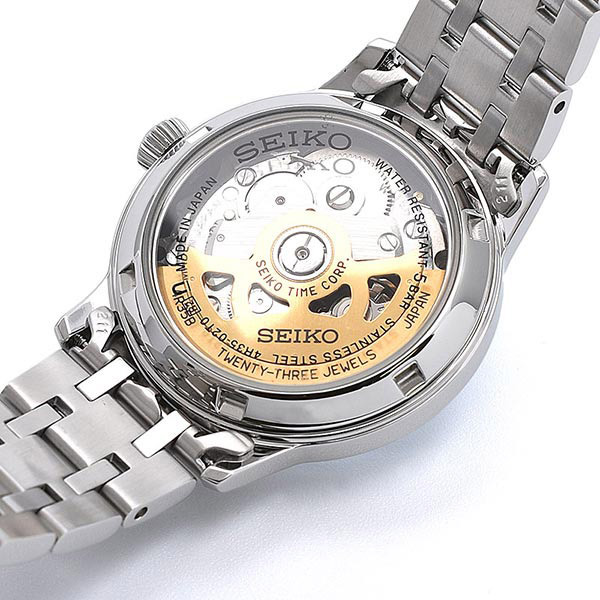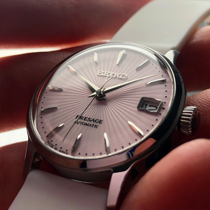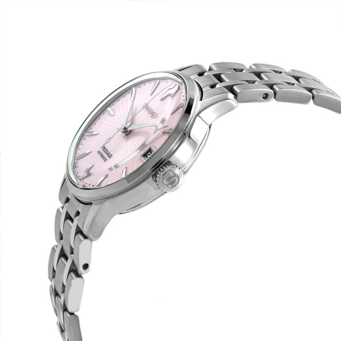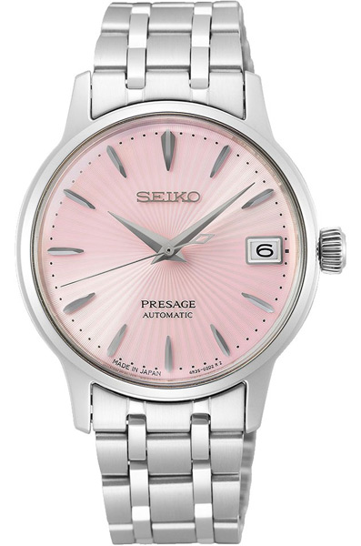 Женские механические наручные часы с автоподзаводом и возможностью ручного завода Seiko SRP839J1 Cosmopolitan Pink коллекции Presage Cocktail Time. Дизайн серии Cocktail Time разработан совместно с известным Японским барменом Шинобу Ишигаки, цвет циферблата данной модели соответствует цвету одного из его коктейлей. Калибр механизма — 4R35. Запас хода более 40-ка часов. 21 600 полуколебаний в час. Количество камней - 23. На данной модели отображается дата. Функция стоп-секунда (остановка секундной стрелки для установки точного времени). Установлено сферическое минеральное стекло повышенной прочности Hardlex Crystal. Завинчивающаяся задняя крышка часов. Водонепроницаемость WR50 (5 атм). Японская сборка (Made In Japan).