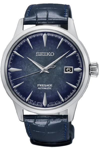 Мужские механические наручные часы с автоподзаводом и возможностью ручного завода Seiko SRPC01J1 Starlight коллекции Presage Cocktail Time. Лимитированная серия, всего выпущено 3500 штук. Дизайн серии Cocktail Time разработан совместно с известным Японским барменом Шинобу Ишигаки, цвет циферблата данной модели соответствует цвету одного из его коктейлей. Калибр механизма — 4R35. Запас хода более 40-ка часов. 21 600 полуколебаний в час. Количество камней - 23. На данной модели отображается дата. Функция стоп-секунда (остановка секундной стрелки для установки точного времени). Установлено сферическое минеральное стекло повышенной прочности Hardlex Crystal. Ремешок — телячья кожа. Завинчивающаяся задняя крышка часов. Водонепроницаемость WR50 (5 атм). Японская сборка (Made In Japan).