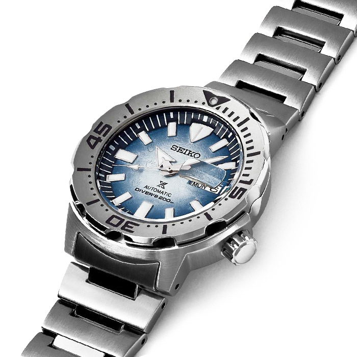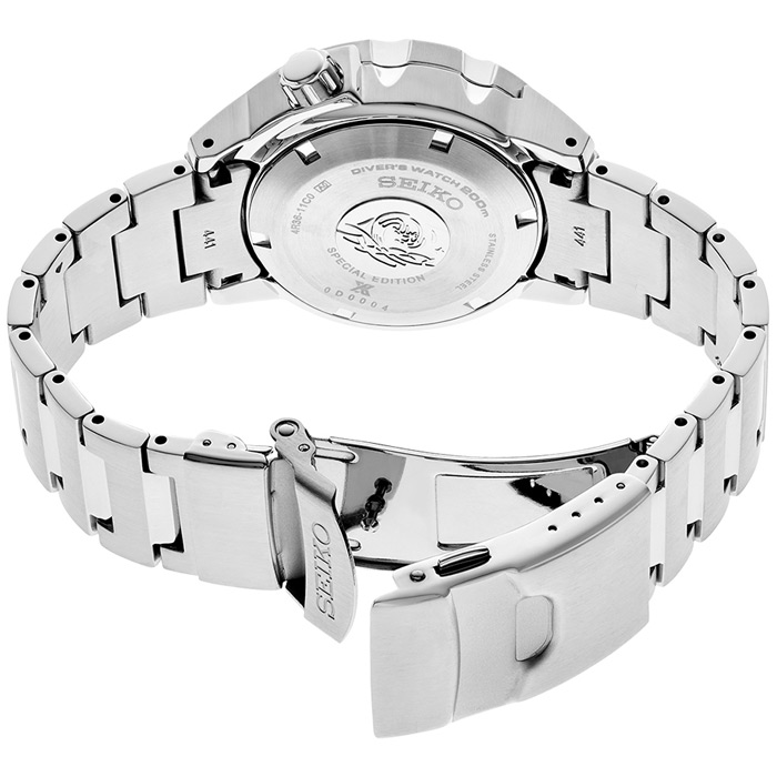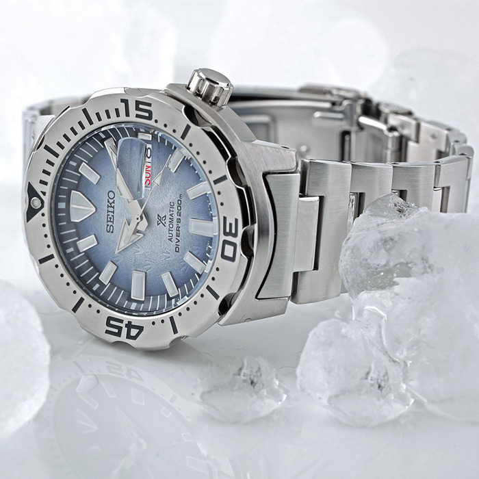 Мужские механические водонепроницаемые наручные часы с автоподзаводом и возможностью ручного завода Seiko SRPG57K1 (SRPG57K1S) Antarctica Monster коллекции Prospex. Специальная серия Save The Ocean Penguin Antarctica — часть средств после продажи данной модели отчисляется в фонд Фабьена Кусто «Save the Ocean». Калибр механизма — 4R36. Запас хода более 40-ка часов. 21 600 полуколебаний в час. Количество камней - 24. На данной модели отображается дата и день недели. Функция стоп-секунда (остановка секундной стрелки для установки точного времени). Стрелки и метки покрыты люминесцентным напылением LumiBright (светятся в темноте). Установлено минеральное стекло повышенной прочности Hardlex Crystal. Вращающийся безель. Стальной браслет. Данная модель обладает высокой степенью водонепроницаемости WR200 (20 атм) и подходит для глубокого погружения под воду. Завинчивающиеся задняя крышка и заводная головка.