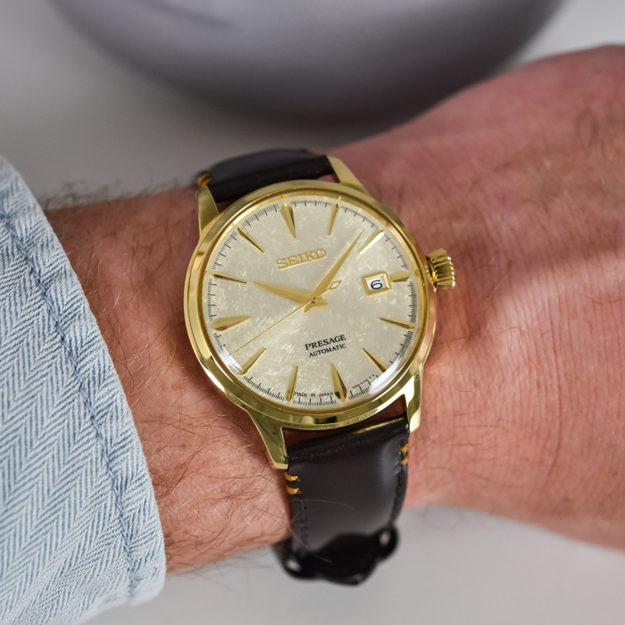 Мужские механические наручные часы с автоподзаводом и возможностью ручного завода Seiko SRPH78J1 коллекции Presage Cocktail Time. Главным вдохновением часов стал оригинальный коктейль авторства одного из самых влиятельных людей в мировой барной индустрии Hisashi Kishi. Напиток «Houjou». Лимитированные Seiko Presage Cocktail Time Star Bar, вдохновленные коктейлем «Houjou». Выпущено всего 5500 экземпляров данной модели часов. Калибр механизма — 4R35. Запас хода более 40-ка часов. 21 600 полуколебаний в час. Количество камней - 23. На данной модели отображается дата. Функция стоп-секунда (остановка секундной стрелки для установки точного времени). Установлено сферическое минеральное стекло повышенной прочности Hardlex Crystal. Ремешок — телячья кожа. Удобная застежка автоматическая клипса. На корпус нанесено стойкое PVD покрытие. Завинчивающаяся задняя крышка часов. Завинчивающаяся задняя крышка часов. Водонепроницаемость WR50 (5 атм). Японская сборка (Made In Japan).