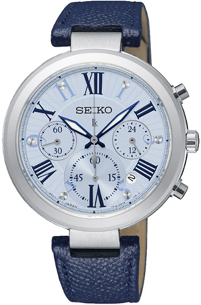 Женские кварцевые наручные часы с хронографом (секундомером) Seiko SRW791P1 коллекции Lukia. Калибр механизма — 7T12. Секундомер может отсчитывать до 60 минут с шагом 1/5 секунды. На данной модели отображается дата. 24-х часовой циферблат. Установлено сапфировое стекло (устойчиво к царапинам). Стрелки покрыты люминесцентным напылением (светятся в темноте). Ремешок — телячья кожа. Водонепроницаемость WR100 (10 атм).
