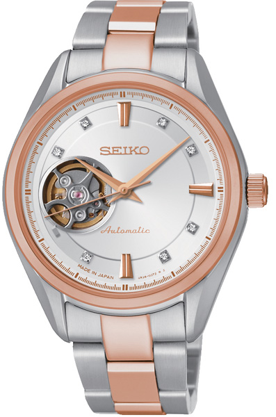 Женские механические наручные часы с автоподзаводом и возможностью ручного завода Seiko SSA866J1 коллекции Presage Японской сборки. Калибр механизма — 4R39. Запас хода более 40-ка часов. 21 600 полуколебаний в час. Количество камней - 24. На данной модели отображается время суток (24-х часовая шкала). Функция стоп-секунда (остановка секундной стрелки для установки точного времени). На циферблате расположено прозрачное окошко, через него частично видно работу механизма, а также циферблат украшен камнями Swarovski. Сапфировое стекло. На корпус и браслет данной модели частично нанесено PVD покрытие. Прозрачная завинчивающаяся задняя крышка часов. Водонепроницаемость WR100 (10 атм). Японская сборка (Made In Japan).