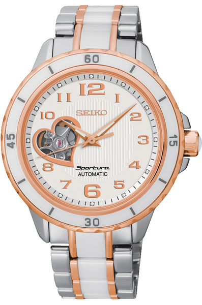Женские механические наручные часы с автоподзаводом и возможностью ручного завода Seiko SSA884J1 коллекции Sportura Японской сборки. Калибр механизма — 4R38. Запас хода более 40-ка часов. 21 600 полуколебаний в час. Количество камней - 24. Функция стоп-секунда (остановка секундной стрелки для установки точного времени). На циферблате расположено прозрачное окошко, через него частично видно работу механизма. Стрелки и метки покрыты люминесцентным напылением LumiBright (светятся в темноте). Сапфировое стекло. На корпус и браслет частично нанесено стойкое PVD покрытие. Керамический безель и керамические вставки на браслете часов. Прозрачная завинчивающаяся задняя крышка часов. Водонепроницаемость WR100 (10 атм). Японская сборка (Made In Japan).