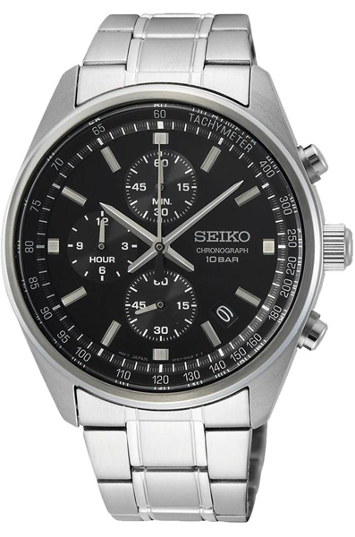 Мужские кварцевые наручные часы с хронографом (секундомером) Seiko SSB379P1 коллекции CS Dress. Калибр механизма — 8T67. Секундомер может отсчитывать до 12 часов с шагом 1/5 секунды, так же на циферблате часов присутствует шкала тахиметра для измерения средней скорости движения. На данной модели отображается дата. Установлено минеральное стекло повышенной прочности Hardlex Crystal. Завинчивающаяся задняя крышка часов. Водонепроницаемость WR100 (10 атм).