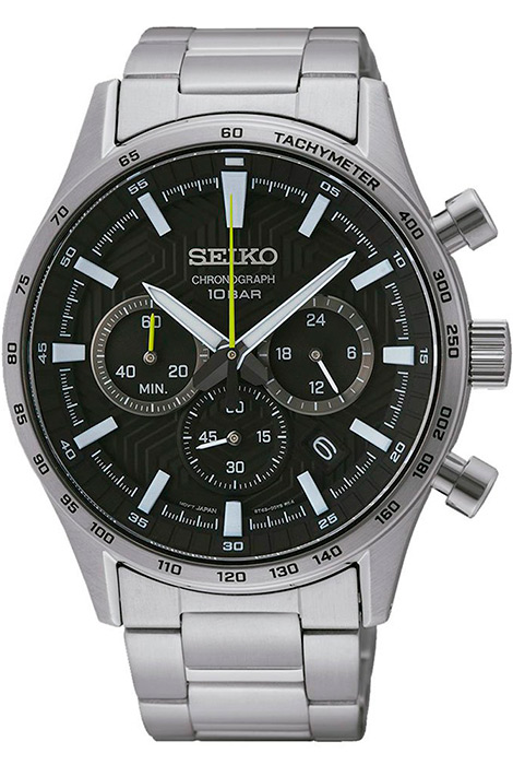Мужские кварцевые наручные часы с хронографом (секундомером) Seiko SSB413P1 коллекции CS Sports. Калибр механизма — 8T63. Секундомер может отсчитывать до 60 минут с шагом 1/5 секунды, так же на корпусе часов присутствует шкала тахиметра для измерения средней скорости движения. На данной модели отображается дата и время суток в 24-х часовом формате. Установлено сапфировое стекло устойчивое к появлению царапин. Стрелки покрыты люминесцентным напылением (светятся в темноте). Завинчивающаяся задняя крышка часов. Стальной браслет. Водонепроницаемость WR100 (10 атм).