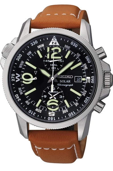 Мужские кварцевые наручные часы с хронографом (секундомером) и будильником на солнечной батарее Seiko SSC081P1 коллекции Prospex. Калибр механизма — V172. Аккумулятор данной модели заряжается от любого источника света. Срок работы аккумулятора с полным зарядом — около 6-ти месяцев. Примерный срок службы аккумулятора — 10 лет. Присутствует функция информирования о недостаточном заряде. Секундомер может отсчитывать до 60 минут с шагом 1/5 секунды. Будильник может быть установлен в течение ближайших 12 часов. На данной модели отображается дата. Стрелки и метки покрыты люминесцентным напылением LumiBright (светятся в темноте). Установлено минеральное стекло повышенной прочности Hardlex Crystal. Вращающийся внутренний безель с отметками компаса. Ремешок — телячья кожа. Завинчивающаяся задняя крышка часов. Водонепроницаемость WR100 (10 атм).