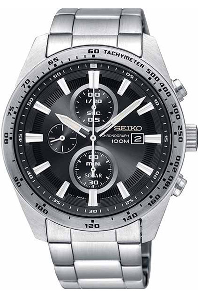 Мужские кварцевые наручные часы Seiko SSC645P1 с хронографом (секундомером) и будильником на солнечной батарее. Коллекция Criteria. Калибр механизма — V172. Аккумулятор данной модели заряжается от любого источника света. Срок работы аккумулятора с полным зарядом — около 6-ти месяцев. Примерный срок службы аккумулятора — 10 лет. Присутствует функция информирования о недостаточном заряде. Секундомер может отсчитывать до 60 минут с шагом 1/5 секунды, так же на безеле часов присутствует шкала тахиметра для измерения средней скорости движения. Будильник может быть установлен в течение ближайших 12 часов. На данной модели отображается дата. Стрелки и метки покрыты люминесцентным напылением LumiBright (светятся в темноте). Установлено минеральное стекло повышенной прочности Hardlex Crystal. Завинчивающаяся задняя крышка часов. Водонепроницаемость WR100 (10 атм).
