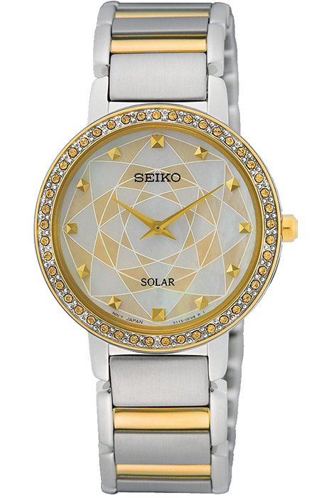Женские кварцевые наручные часы на солнечной батарее Seiko SUP454P1 коллекции CS Dress. Тонкий корпус — всего 6.8 мм. Калибр механизма — V115. Аккумулятор данной модели заряжается от любого источника света. Срок работы аккумулятора с полным зарядом — около 12-ти месяцев. Примерный срок службы аккумулятора — 10 лет. Установлено минеральное стекло повышенной прочности Hardlex Crystal. Корпус украшен кристаллами Swarovski. Стальной браслет. На корпус и браслет частично нанесено стойкое PVD покрытие.