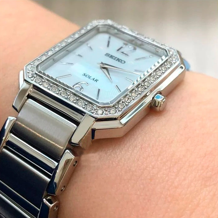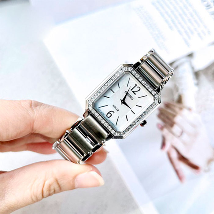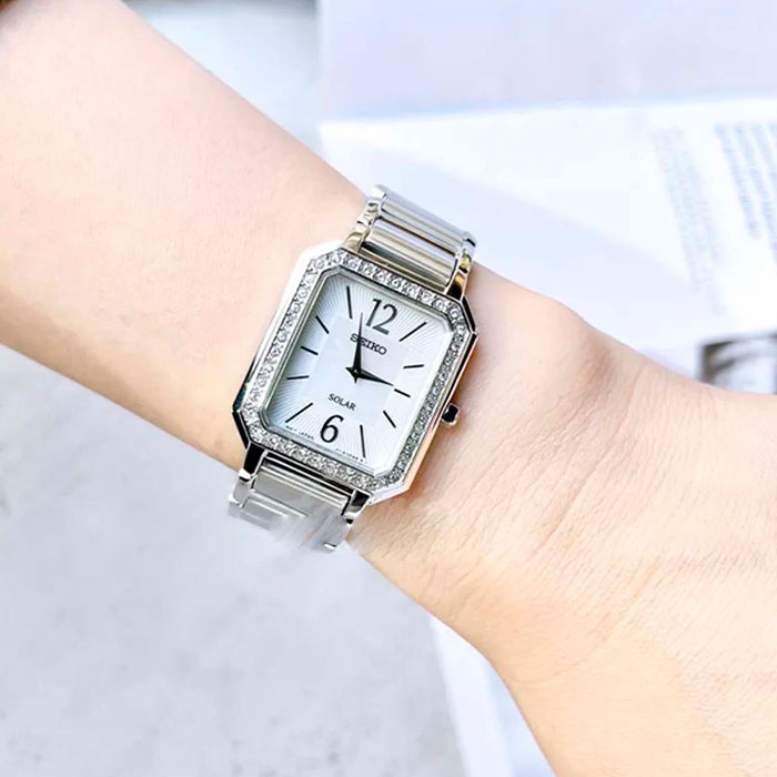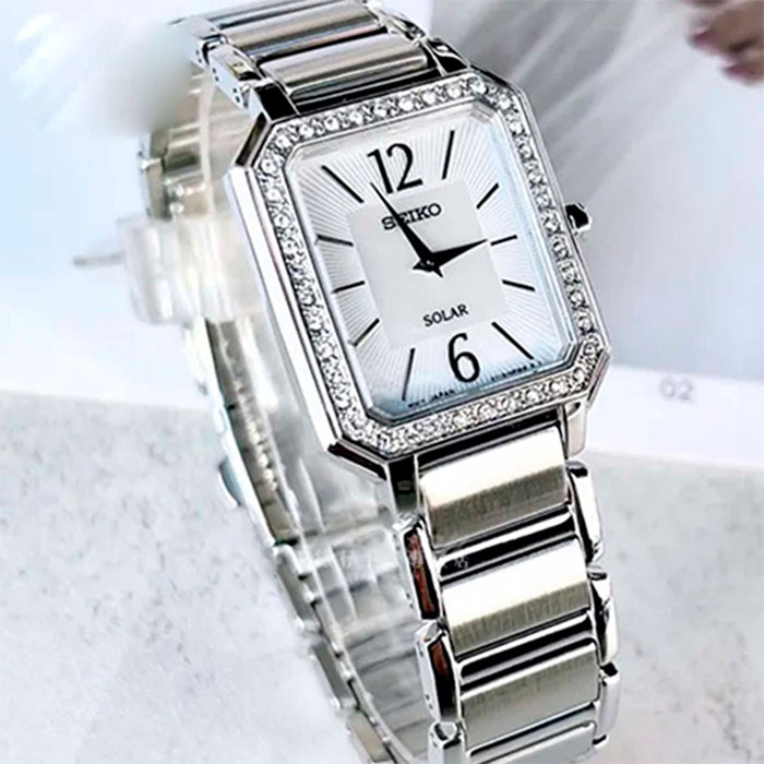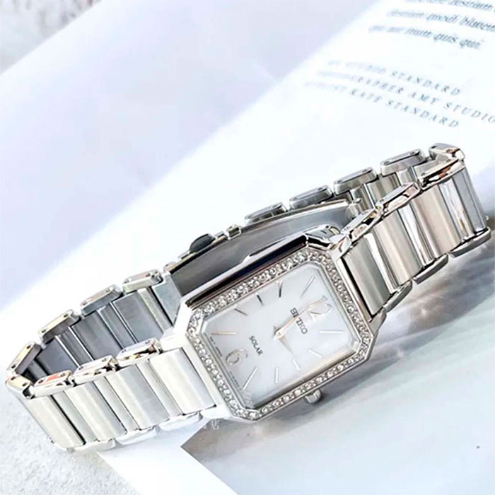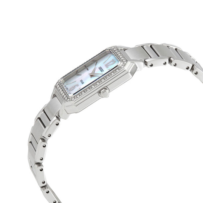 Женские кварцевые наручные часы на солнечной батарее Seiko SUP465P1 коллекции CS Dress. Тонкий корпус — всего 6.3 мм. Калибр механизма — V115. Аккумулятор данной модели заряжается от любого источника света. Срок работы аккумулятора с полным зарядом — не менее 12-ти месяцев. Примерный срок службы аккумулятора — 10 лет. Установлено минеральное стекло повышенной прочности Hardlex Crystal. Корпус украшен кристаллами Swarovski. Стальной браслет. Водонепроницаемость WR (3 атм).