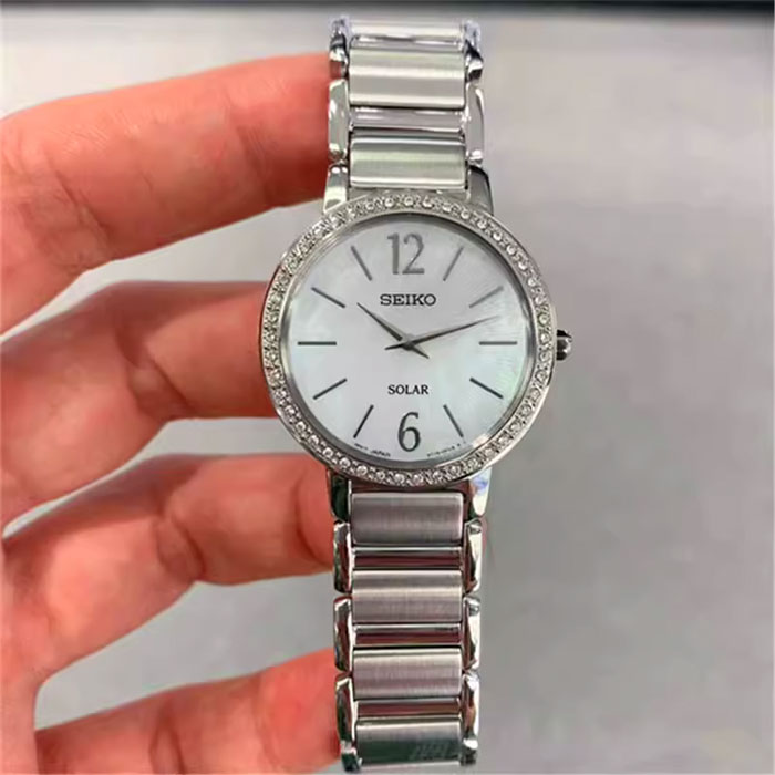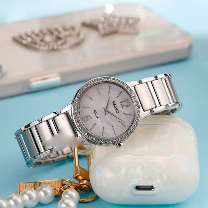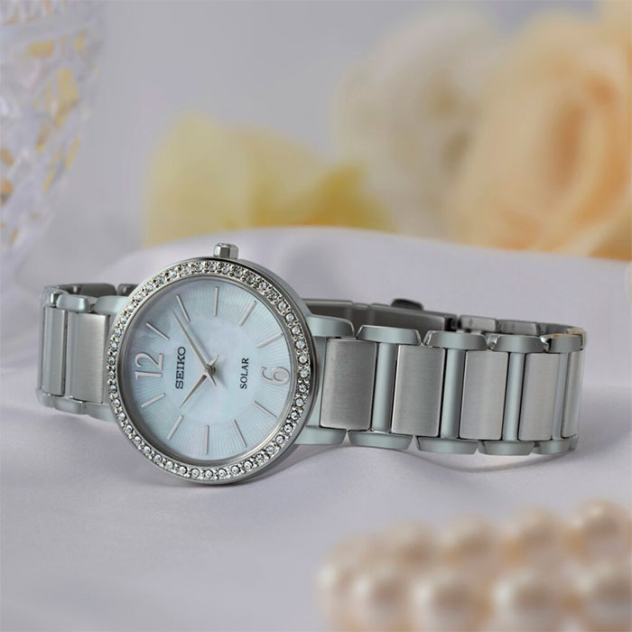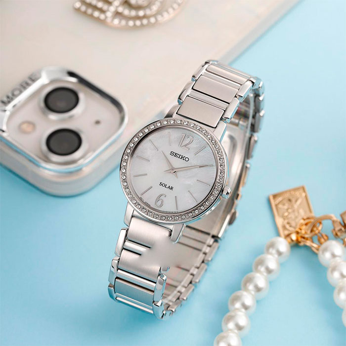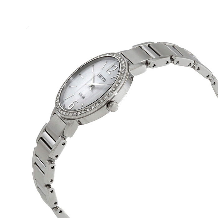 Женские кварцевые наручные часы на солнечной батарее Seiko SUP467P1 коллекции CS Dress. Тонкий корпус — всего 6.8 мм. Калибр механизма — V115. Аккумулятор данной модели заряжается от любого источника света. Срок работы аккумулятора с полным зарядом — не менее 12-ти месяцев. Примерный срок службы аккумулятора — 10 лет. Установлено минеральное стекло повышенной прочности Hardlex Crystal. Корпус украшен кристаллами Swarovski. Стальной браслет. Водонепроницаемость WR (3 атм).