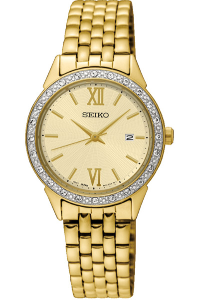 Женские кварцевые наручные часы Seiko SUR688P1 коллекции Promo. Калибр механизма — 7N82. На данной модели отображается дата. Установлено минеральное стекло повышенной прочности Hardlex Crystal. Корпус украшен камнями Swarovski. На корпус и браслет нанесено стойкое PVD покрытие.