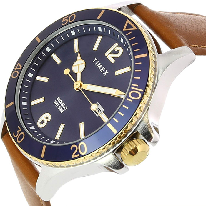 Мужские кварцевые наручные часы Timex TW2R64500 коллекции Harborside Coast. На данной модели отображается дата. Уникальная электролюминесцентная подсветка INDIGLO, которая освещает весь циферблат ярким бирюзовым светом при нажатии на заводную головку, что позволяет прекрасно видеть показания циферблата в сумерках или даже в полной темноте. Стрелки и метки покрыты люминесцентным напылением (светятся в темноте). Кожаный ремешок. На корпус частично нанесено стойкое покрытие. Вращающийся безель. Водонепроницаемость WR50 (5 атм).