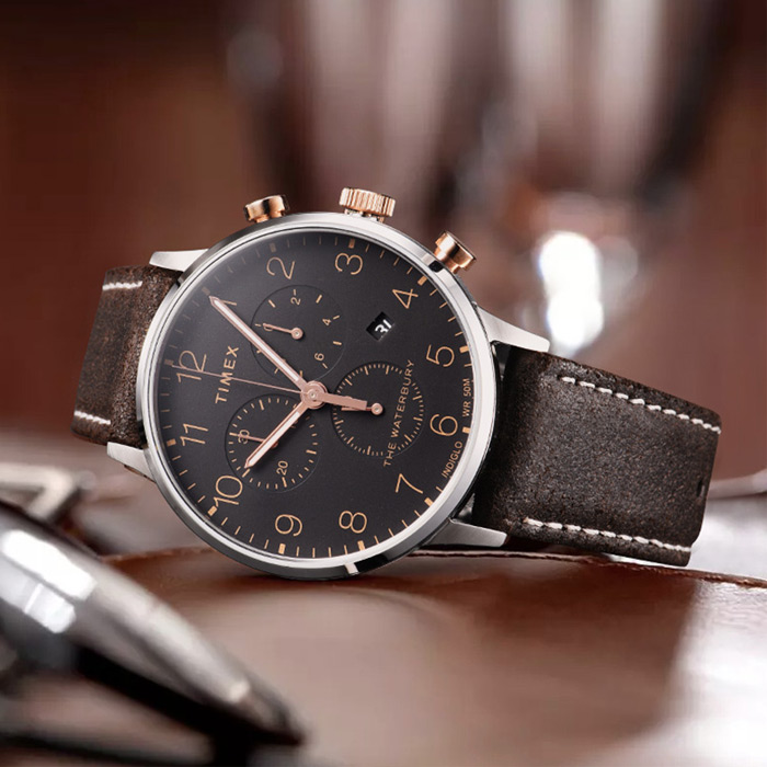 Мужские кварцевые наручные часы с хронографом (секундомером) Timex TW2T71500 коллекции Waterbury Classic Chronograph. Уникальная электролюминесцентная подсветка INDIGLO Night-Light с ночным режимом, которая освещает весь циферблат ярким бирюзовым светом при нажатии на заводную головку, что позволяет прекрасно видеть показания циферблата в сумерках или даже в полной темноте. Стрелки покрыты люминесцентным напылением (светятся в темноте). Хронограф с точностью до 1/20 секунды. На данной модели отображается текущая дата. Кожаный ремешок с текстильной основой. Водонепроницаемость WR50 (5 атм).