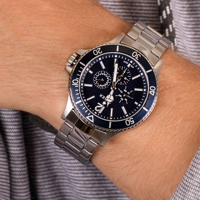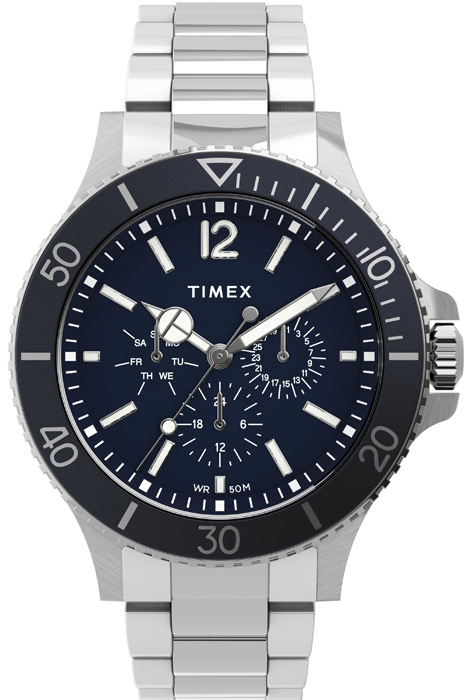 Мужские кварцевые наручные часы Timex TW2U13200 коллекции Harborside Coast. На данной модели отображается дата, день недели и время суток в 24-х часовом формате. Уникальная электролюминесцентная подсветка INDIGLO, которая освещает весь циферблат ярким бирюзовым светом при нажатии на заводную головку, что позволяет прекрасно видеть показания циферблата в сумерках или даже в полной темноте. Стрелки и метки покрыты люминесцентным напылением (светятся в темноте). Стальной браслет. На корпус частично нанесено стойкое покрытие. Вращающийся безель. Водонепроницаемость WR50 (5 атм).
